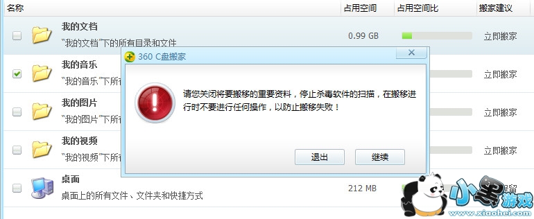 第五步:在弹出的窗口中,确保将要进行搬家的程序已退出的情况下,点击“继续”按钮。