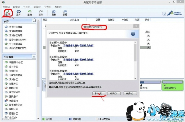 4、点击分区助手左上角“提交”出现(等待执行操作的对话窗口)。在点击“执行”即可。