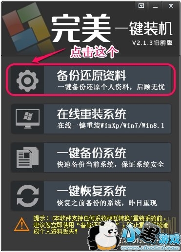 首先运行完美一键装机软件,然后点击备份还原资料如下图所示: