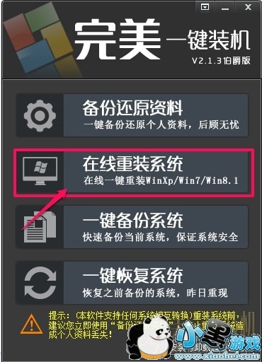 完美一键装机在线重装系统,通过以上两步安全措施后,我们开始重装系统吧!