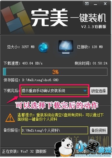 提示:完美一键装机软件支持断点续传,在下载文件时您大可以随时关闭软件,下次在运行软件安装选择相同的系统,软件会接着上次下载的进度继续下载。 进入下载页面了,在这个页面里有个下载完成后的选项,默认是“提示重启手动确认安装系统”,意思是说系统镜像文件下载完成后,会弹出个询问框,问您是不是要现在立即重启并安装系统。“只下载系统,不安装系统。”这个没什么好说的,就是只下载系统镜像文件保存在硬盘,先不安装系统。“无需确认自动重启并安装系统”,下载镜像完成后,电脑就会直接重启并安装系统,如果您人不在出去外面了,可以选择这个。