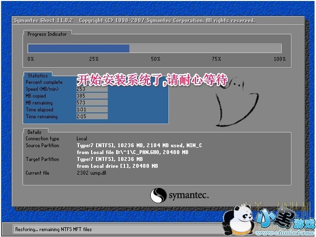 3.重启后会进入GHOST还原界面,如果您重启后直接进系统了。并没有进入下面的画面,一般来说是杀毒软件阻止了。请先进入系统,退出杀毒软件然后重新点击安装系统。