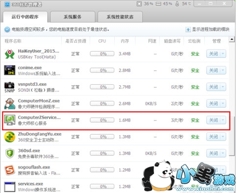 2、下载之后,会自动打开任务管理器,找到运行中的程序内找到鲁大师核心服务,并点击关闭。