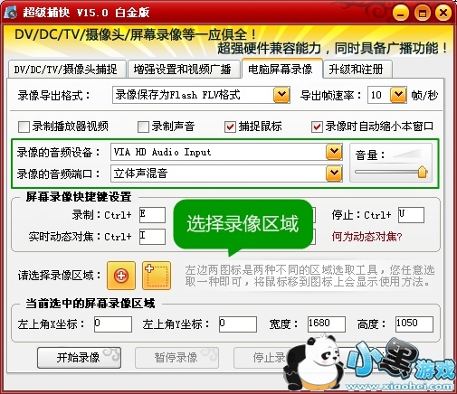 使用橙色录像区域选择工具,帮助我们准确的选择录像区域。软件支持边录视频,边录声音。如下图所示,在“录像的音频设备”处选择声卡名称,在“录像的音频端口”处选择正确的音频端口即可。建议安装声卡最新官方驱动,让声卡的性能更大的发挥出来。