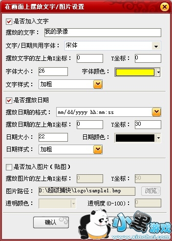 除了录制摄像头视频,我们还可以为视频添加水印、文字、录像日期等。点击“DV/DC/TV/摄像头捕捉”选项卡下方的“设置文字/贴图”按钮,在在弹出的对话框中即可设置。你可以为录制的视频打上自己的LOGO!