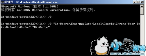 第五步:在弹出的命令行窗口输入 : mklink /D "C:/Users/登录用户名/AppData/Local/Google/Chrome/User Data/Default/Cache" "R:/Cache"
