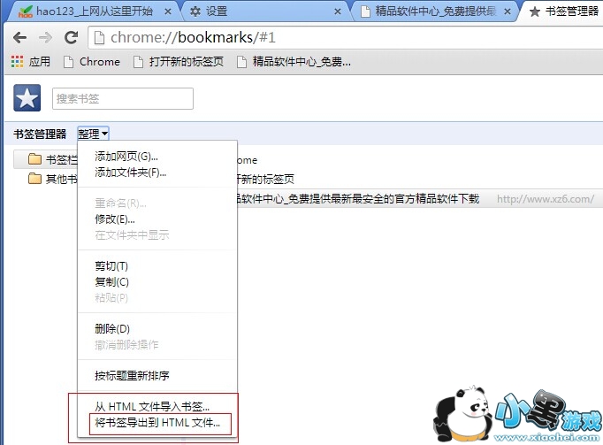 第四步:点击书签管理器的整理,最下面的将书签导出到html文件..