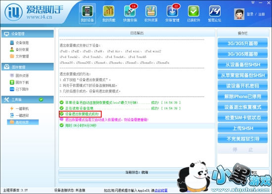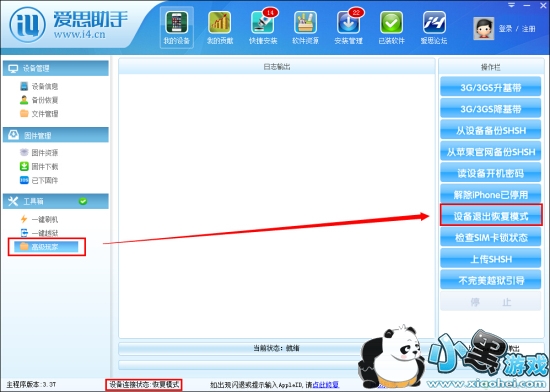 2、退出恢复模式的操作:点击工具箱的“高级玩家--设备退出恢复模式”程序将自动运行。