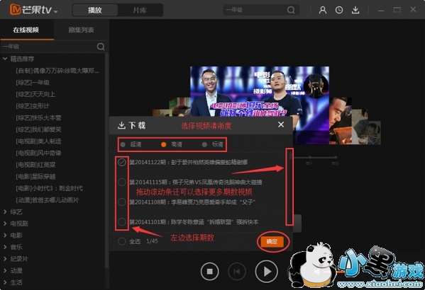 2.然后再选择要下载的期数以及清楚程度(有超清、高清、标清),最后点确定即可。