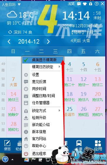 显示在桌面上的精简版日历可以调整月份、位置、自由拖动、查看未来天气。人生日历将普通版的功能择优放在了精简版的透明日历上。如果您只需要选择查看日历,那么可以点击透明日历左上角的小锁,将透明日历锁在桌面上,这样您的鼠标就只能前后调整月份,而不能进行其他操作。