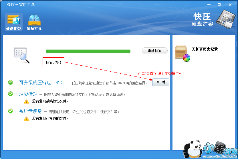 2.进入扩容界面后,自动扫描全盘,把低压缩率的压缩包、垃圾文件、缓存文件等扫描出来。扫描完成后,点击下面分类后面的"查看"按钮,进行升级或清理。
