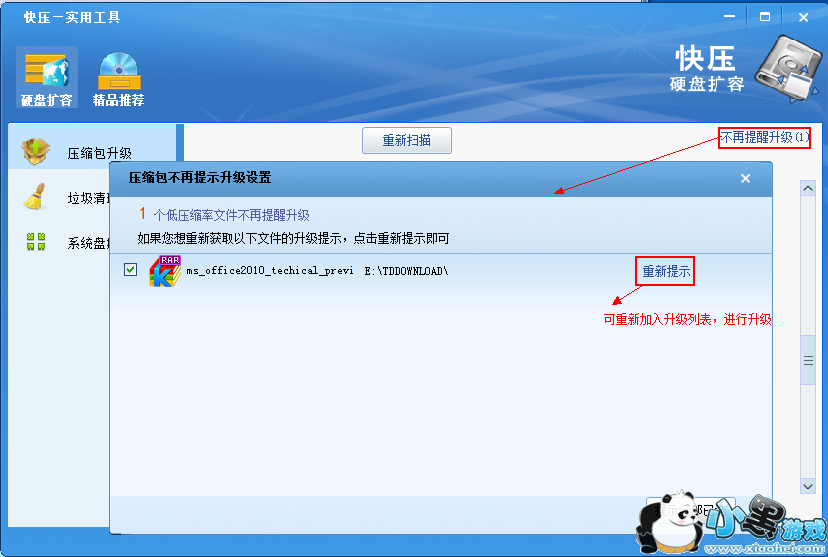 4.点击"不再提醒升级",可以看到之前过滤掉的压缩包文件列表,如想继续升级某些压缩包,则点击"重新提示"项,即可在升级列表继续升级。