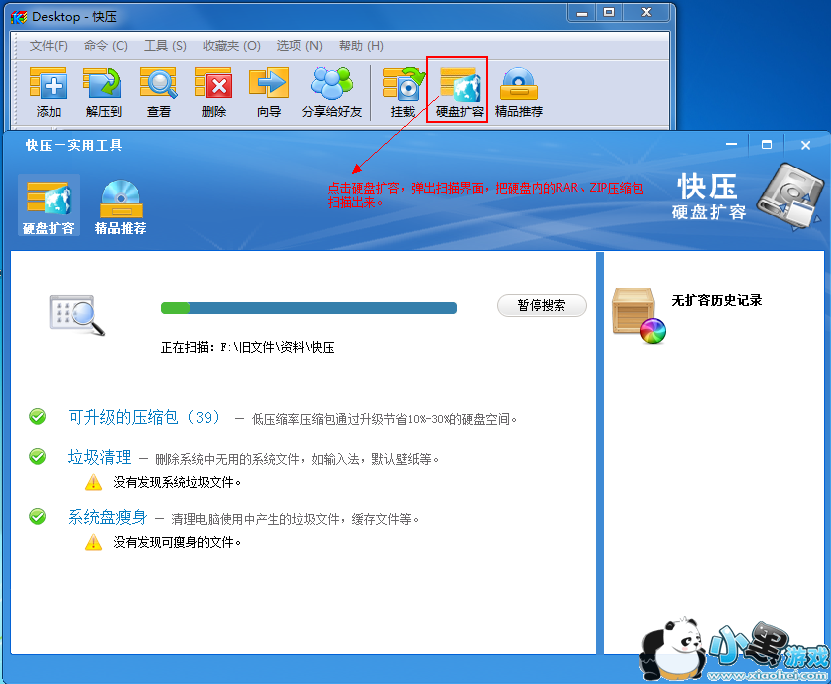 1.打开快压主界面,在工具栏点击"硬盘扩容",弹出扩容界面。
