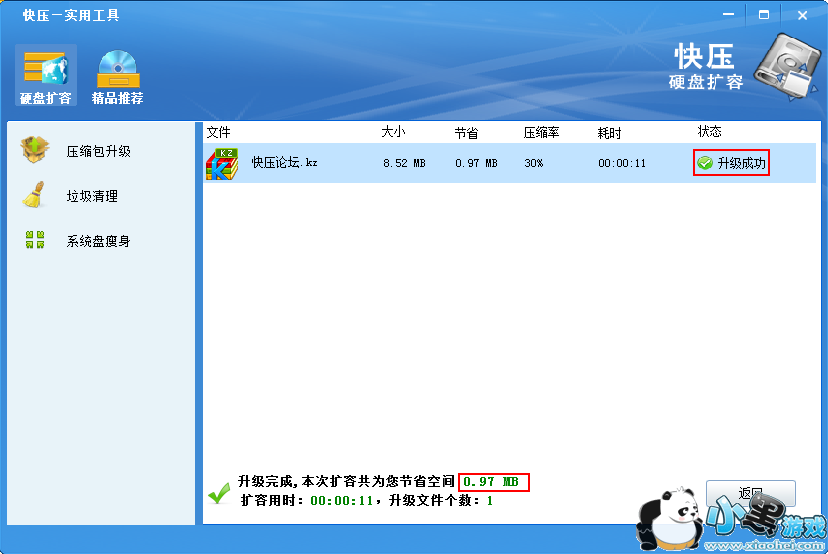 快压中有一个非常实用的硬盘扩容功能,通过清理系统中的垃圾文件、系统瘦身,还可以把低压缩率的RAR、zip文件转化为高压缩率的KZ压缩包来扩大硬盘容量,下面说说使用方法。