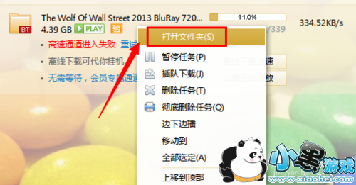 待迅雷下载一会儿,右击正在下载的任务,从弹出的菜单中选择“打开文件夹”项。