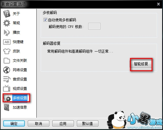 打开影音先锋,点击左上方那几个字,选择设置选项中的多核设置,智能修复一下解码器