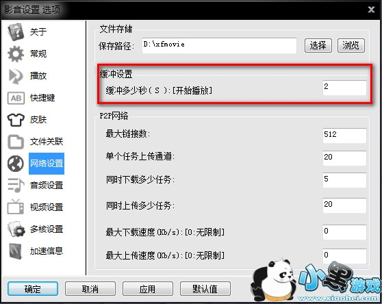 2、在设置页面中找到“网络设置”点击,然后在缓冲设置这里进行下更改,默认是2秒开始播放下载,我们为了下载快直接把缓冲改成“1”让它加速下载,“0”是无法设置,最低是1。