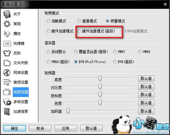 3、下面点击“视频设置”,在视频设置的页面中选中“硬件加速模式(高级)”。这里可以有效的提升速度,然后点击确定。
