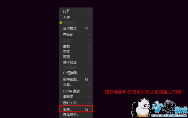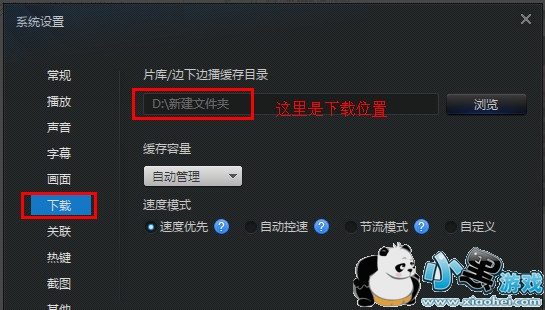 注意:下载位置在播放电影时,右击鼠标或点击键盘上F2键,弹出菜单中选择“设置”项。然后弹出对话框中,点击左侧的下载项,然后在右侧可以看到下载的位置。