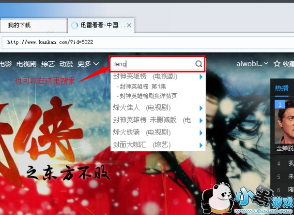 步骤三:然后在迅雷副主页面上打开迅雷看看网页,点击右侧的热播的电影或上方的搜索栏输入想要看的电影名称。