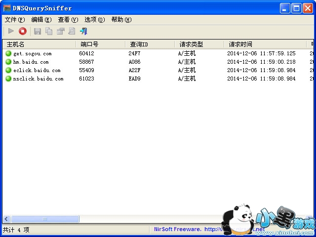 我使用的是一个名为DNSQuerySniffer的嗅探工具,该工具能够实时显示本地电脑的DNS查询记录,对于每一个DNS解析查询,显示以下信息:主机名,端口号,查询ID,请求类型,请求响应时间,响应代码等记录,并返回的DNS记录的内容。