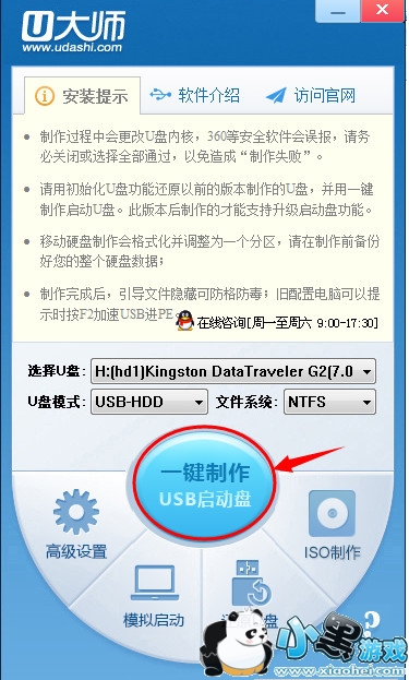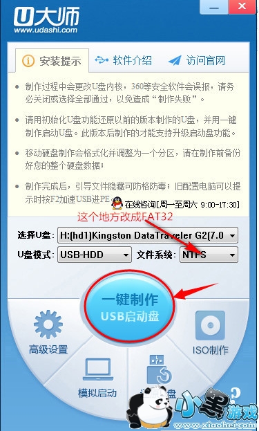 方法四:有些XP系统不支持U盘的NTFS格式,我们在制作的时候把U盘格式选择为FAT32.然后点击“一键制作”就可以成功了
