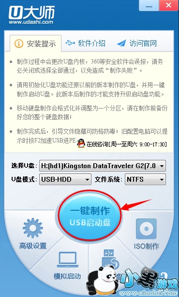 方法三:打开我的电脑,在U盘上面点格式化,选择快速格式化,开始后,如果弹出不能格式化的提示,那说明你有其它的软件正在使用你的U盘,你可以先把U盘拨出后,再插入USB接口,然后再试,确定能格式化U盘的情况后。点击U大师“一键制作”即可。