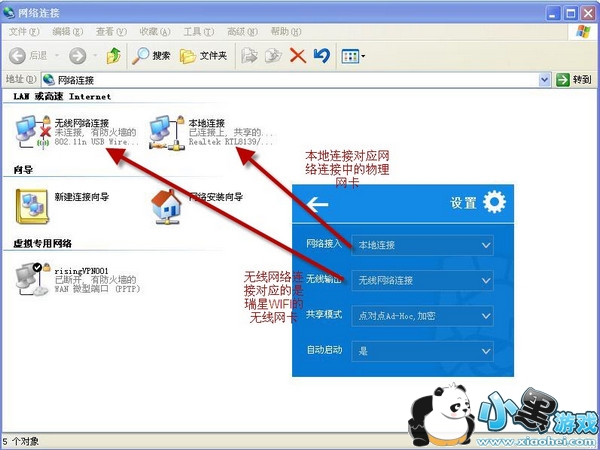 这里提到共享用户的电脑网络,必然是通过电脑的物理网卡来提供网络接入本地连接,而提供无线网络接入服务那就是由瑞星安全WiFi提供无线输出。如图所示的无线输出是空的,所以瑞星随身WiFi软件程序就会提示没有可用的无线设备。