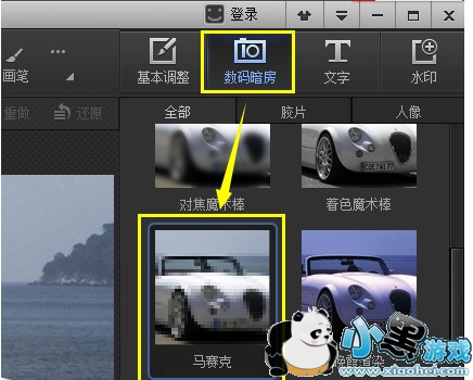 步骤一:打开你的“光影魔术手”,导入你要处理的图片,点击“数码暗房”按钮,接着在打开“全部”列表中点击“马赛克”