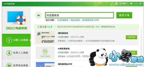 方法四:修复360浏览器一是可以使用浏览器自带的浏览器医生功能进行修复,点击浏览器医生,选择一键修复即可。二是使用360安全卫士的360电脑救援功能,打开电脑救援,输入“浏览器崩溃”,即可出现各种浏览器崩溃问题的修复功能,点击修复就行了。