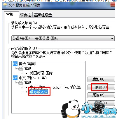 方法六:有些小的输入法会导致浏览器奔溃(例如:点心,速浪,万能,小晨,速拼等)大家可以更换其他输入法或者在在文字服务与输入语言框, 已经安装的服务里有输入法列表。选择需要删除的输入法,点击右边的(删除)