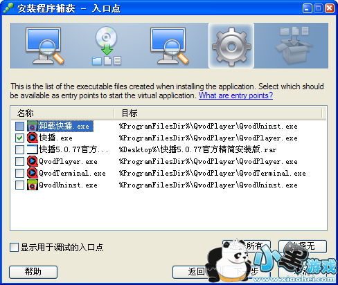 8、再次扫描结束后出现入口点窗口,开始选择快播运行时的主程序文件(也就是生成的便携版软件运行时的主程序文件)。注意,千万不要选错文件,否则生成的便携版软件无法运行!选完后点击“下一步”: