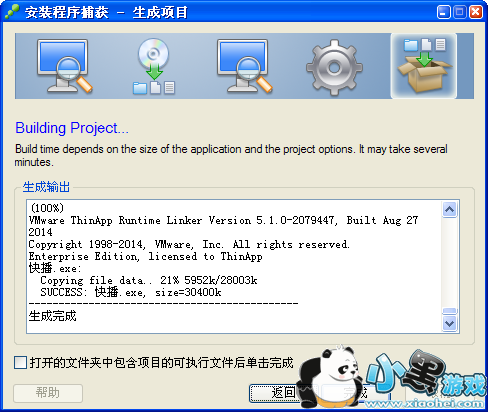 18、生成完成后出现此窗口,点击“完成”按钮, 便携版快播就已经制作完成,VMWare ThinApp会自动退出。