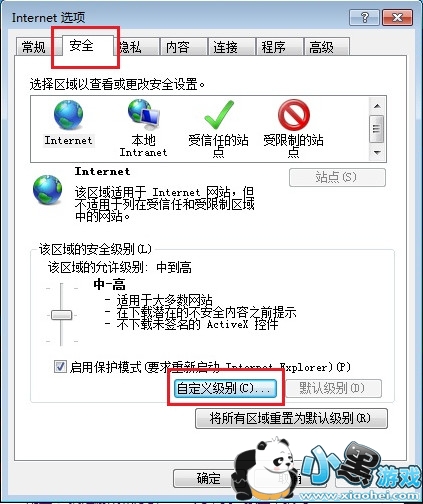 二、打开Internet选项后,再切换到【安全】选项卡,然后再点击底部的【自定义级别】,如下图所示。