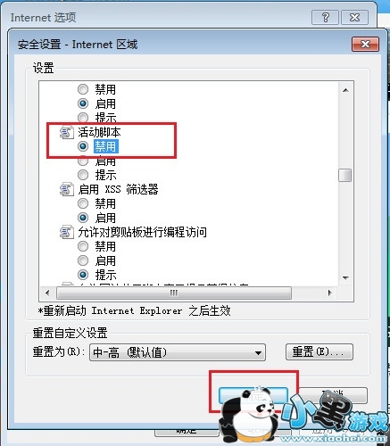 三、然后在打开的【安全设置-Internet区域】对话框中,找到【活动脚本】设置选项,然后将默认的“启用”更改为【禁用】,最后再一路点击底部的【确定】即可。