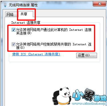 步骤四:并在打开的“无线网络属性”窗口中切换至“共享”选项卡,勾选两个选项,最后点击“确定”完成设置。
