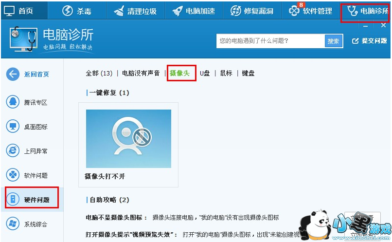 方法三:使用腾讯电脑管家修复,选择“电脑诊所”==“硬件问题”==“摄像头”。