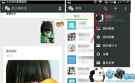3)在“松江微生活”中,发送你需要加V的图片,不需要多久,就会发现“成功加V”的回复,下载加V的图片,然后更换掉你的微信头像,就可以发现微信头像已经成功加V了。