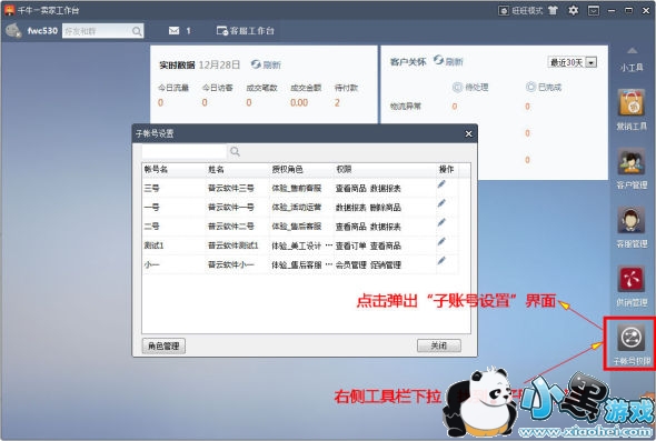 必须是主账号登录千牛,右侧工具栏下拉,找到“子账号权限”。点击图标弹出“子账号设置”界面。