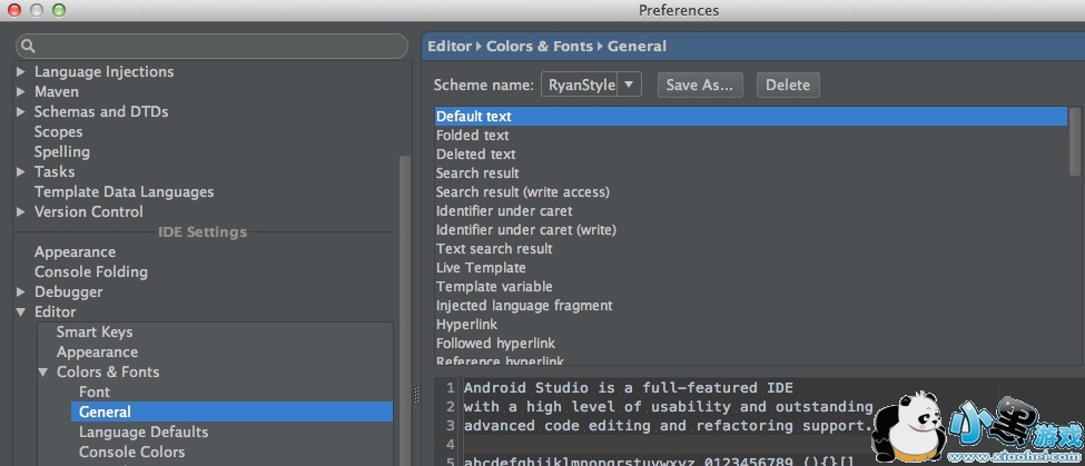 最后需要说明的是,大家看到我的主界面是暗色风格,和Google演示的是一样的风格,大家第一次使用打开的是默认风格(亮色),如果想要修改的话,进入Preferences(按Command+,)到IDE Settings下选择Colors&font并设置Schema name为Darcula就可以设置成暗色风格,如果需要自己定义样式,比如字体大小颜色等,可以新建一个Schema来自己定义