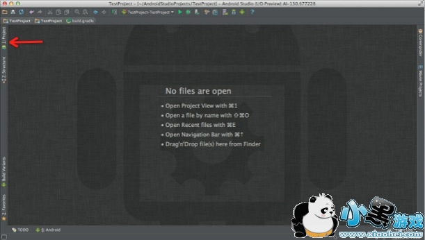 新建工程完毕后就进入了Android Studio主界面。第一次进去可能如下图所示什么也没有,点击箭头所示按钮展开目录结构,