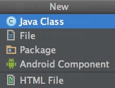 3.新建文件方式的不同,右键选择New或Command+N后出现新建菜单,类型有Java Class,也就是一般的java类,File就是普通文件,Package就是建包,值得注意的就是Android Component,它直接提供了Android中基本组件的创建。