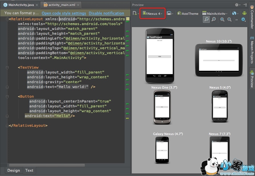 最炫的功能要来了,实时编写并预览布局文件,此项功能着实大大提高开发效率,打开一个xml布局文件点击右侧Preview选项卡即可唤出预览界面,可以选择很多尺寸的手机进行预览: