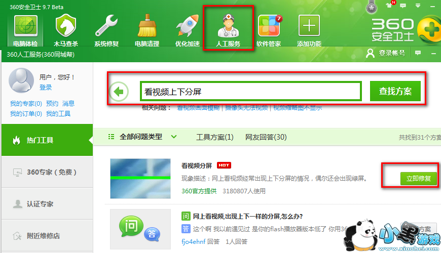 方案一:使用360安全卫士,人工服务==输入看视频分屏==立即修复
