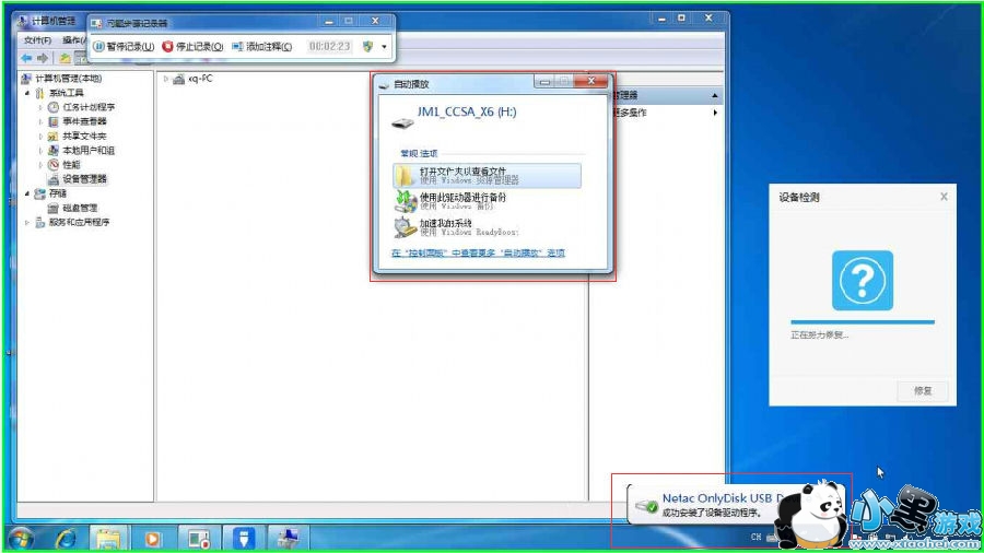 在USB宝盒修复U盘的过程中,电脑右下角会提示是否修复成功,且修复成功之后,U盘的自动播放窗口会自动弹出来。此时,可以90%确定U盘驱动已经修复成功。