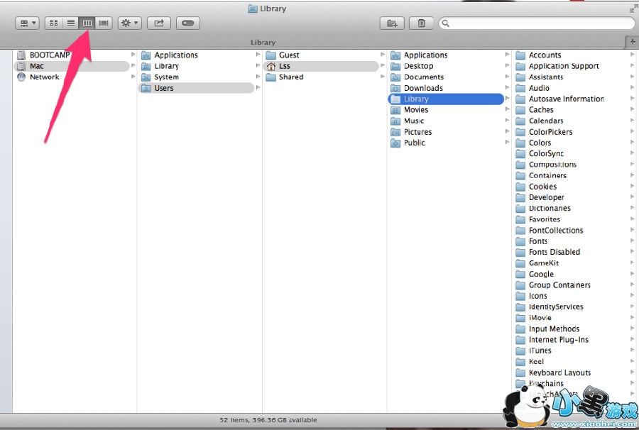 1、还是找到Go那个菜单选项,点击开之后不要选择,按住Option,你会发现中间会出现library选项,单击即可以直接去到library文件夹。在library文件夹下选择第三种模式的文件显示模式,这样可以看到上层的许多文件。