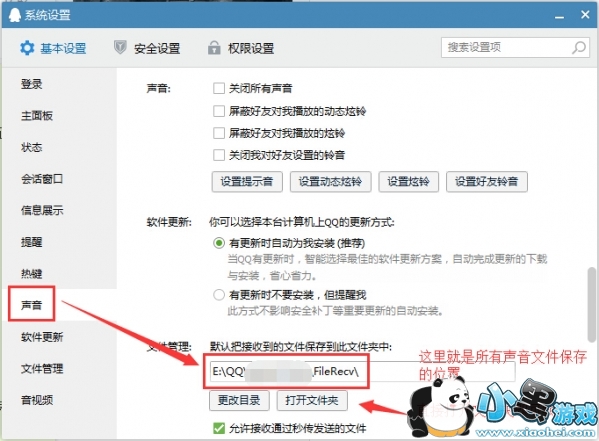 2.再找到声音--右边可以看到声音文件保存的目录。直接点打开文件夹,然后找到与自已qq号同名的文件夹,再在此文件夹里面找到Audio即可。