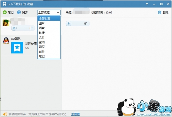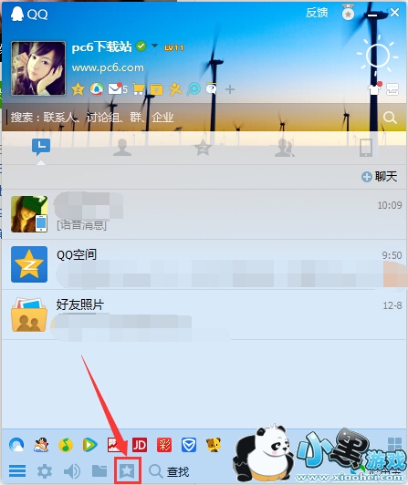 1.在pc6下载并安装最新版qq(因为最新版的qq才有收藏功能),然后在主界面最下面找到收藏图标(在查找左边)