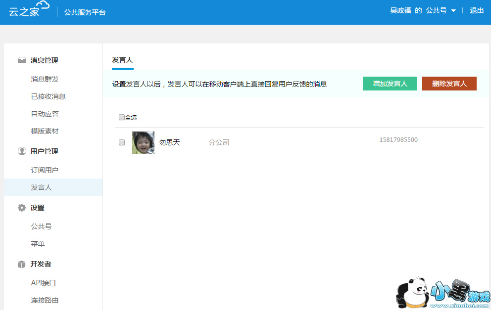 2、发言人管理,可以添加或删除发言人,设置发言人以后,发言人可以在移动客户端上直接回复用户反馈的消息
