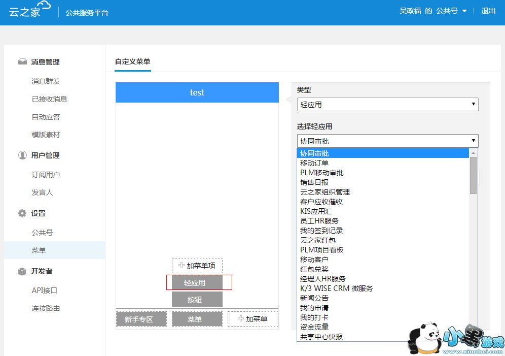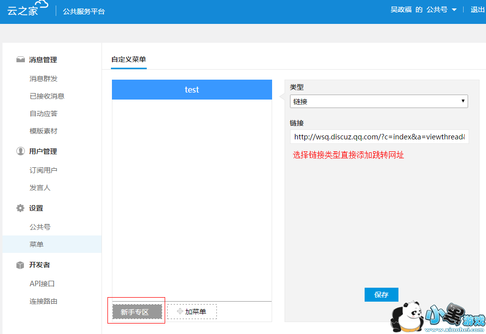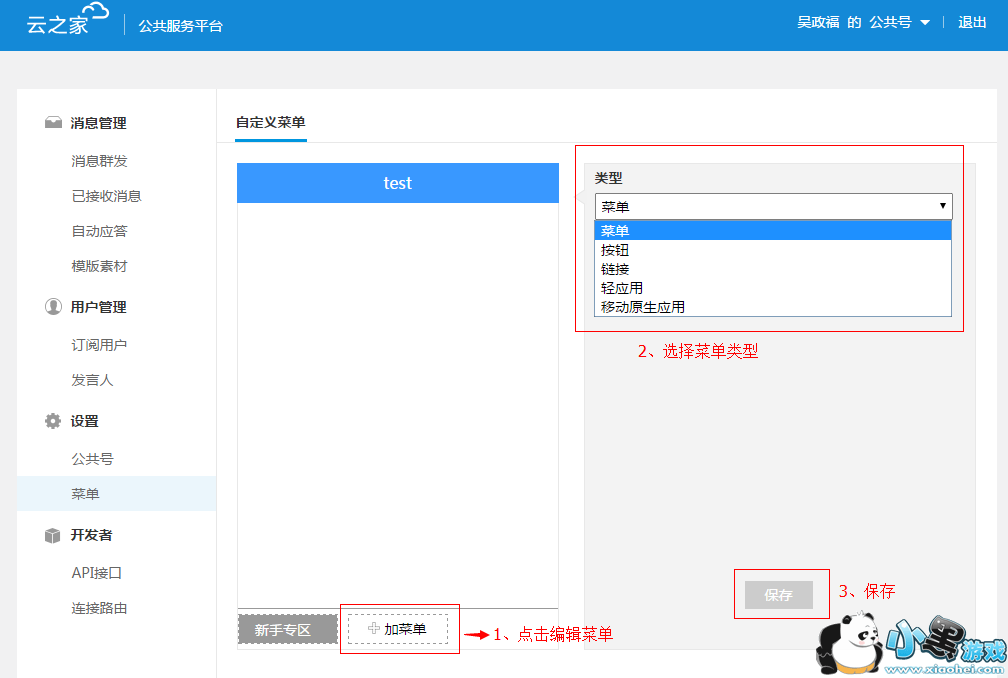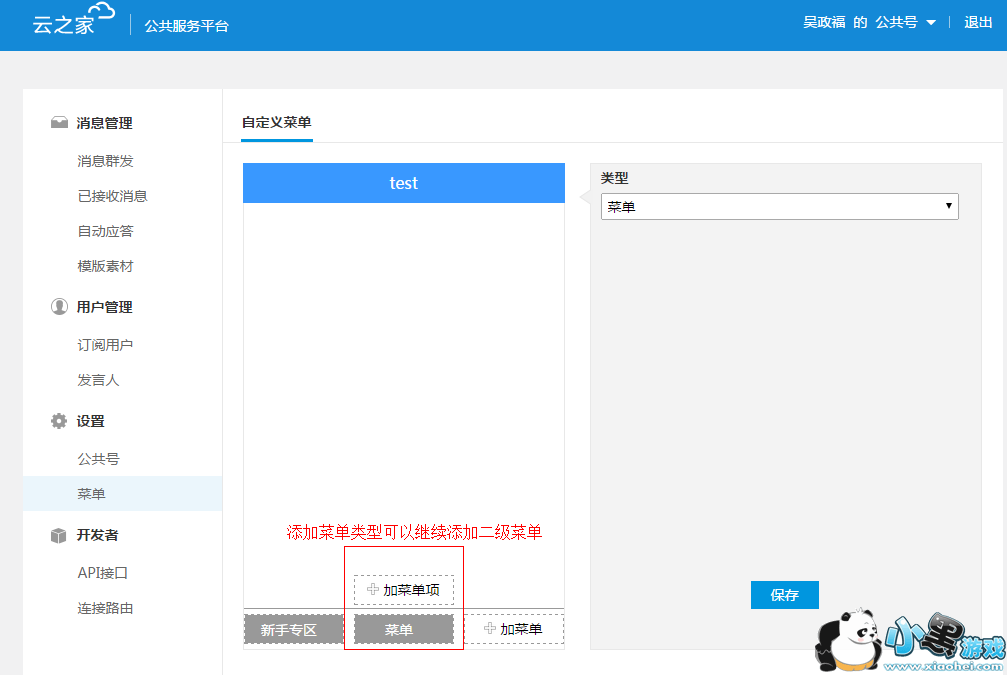 5、自定义菜单,先添加菜单名称,选择菜单类型,然后保存。